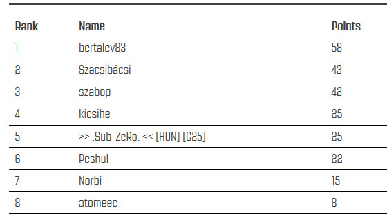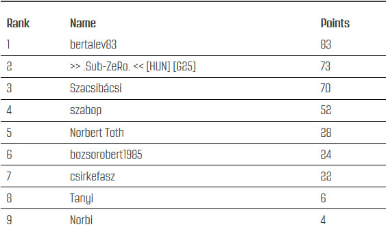 | 3. Kicsihe | 3 | -,-,-,1,1,1 | 75 pont | 3. csmarcell15 | 3 | 1,1,1,-,-,- | 75 pont |